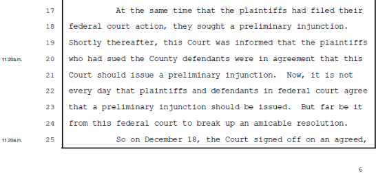 Page 32-33 the Court addresses whether it is to the benefit of the public (and justice) to be left without a defender in this case (if he does not allow Zega’s clients to intervene—which he ultimately did not for procedural reasons), since the paid advocate for the county, Brian Lester, has agreed with the Plaintiffs from the beginning of the case (with an agreed preliminary injunction against the Q Ct), that the Q Ct is guilty of discrimination under the law.